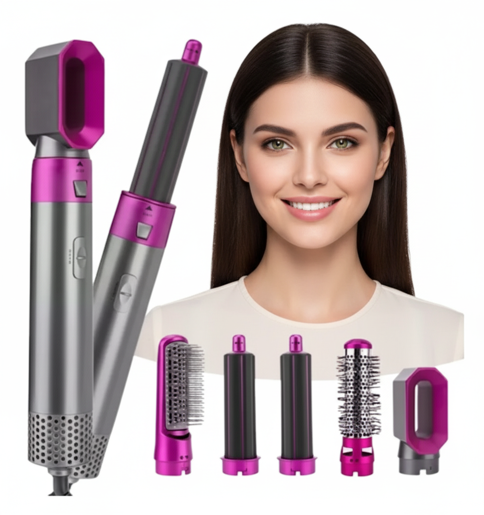 Incluye 5 accesorios intercambiables para alisar, rizar, dar volumen, crear ondas y peinar, ofreciendo versatilidad total para cualquier estilo, desde liso perfecto hasta rizos definidos u ondas suaves.